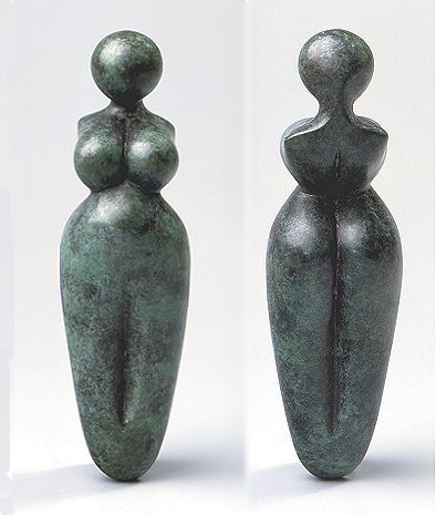 BÓINN (14 x 5cms, Patinated Bronze 1999) The eponymous goddess of the river Boyne who nourishes the Earth with her milk. She is the cosmic cow producing galactic milk, human milk and new foods, she who gives blessings from heaven above and from the abyss below, blessings of Mother life. Her gifts are seen to pour from the sky, from the dark abyss of the unknown and from humanity. "I have breasts therefore I am" says the great Mother.